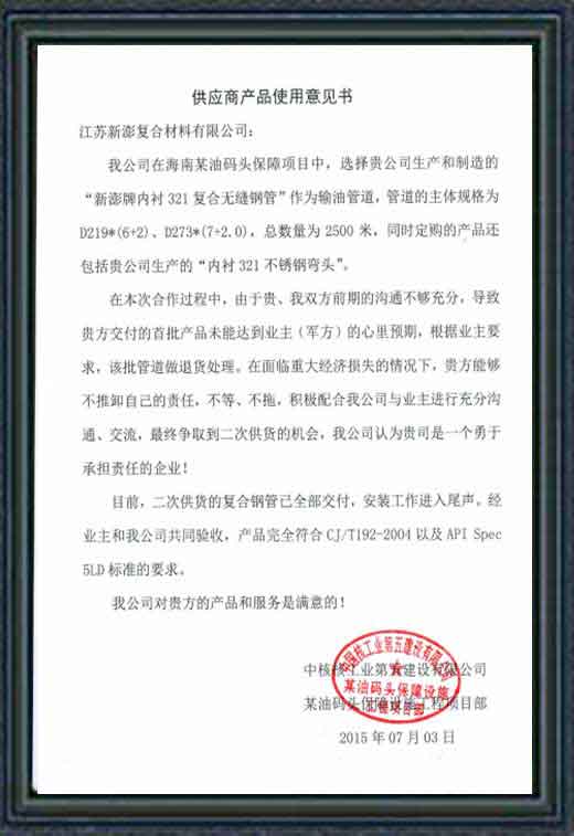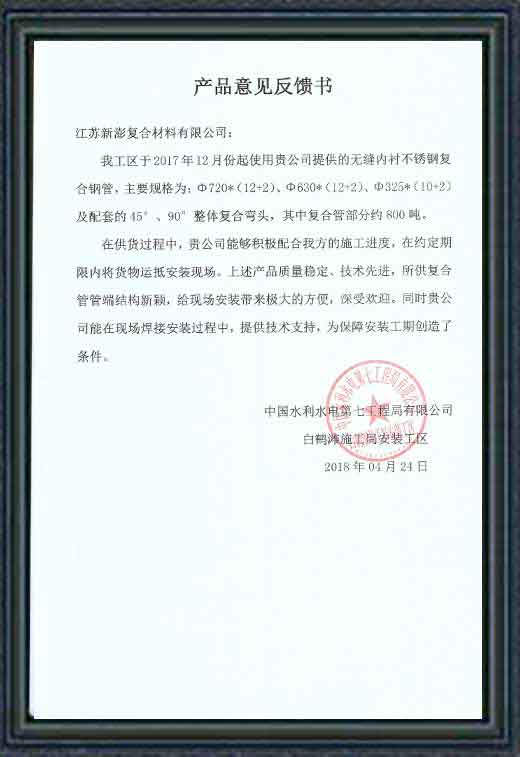 臨江市引泉入城項目,管道總長108公里、被稱為全球最長距離天然礦泉水輸送工程,輸送壓力4MPa;我司提供DN700內襯不銹鋼螺旋焊管及配套管件,供貨總量超過30公里(供貨時間2016)。